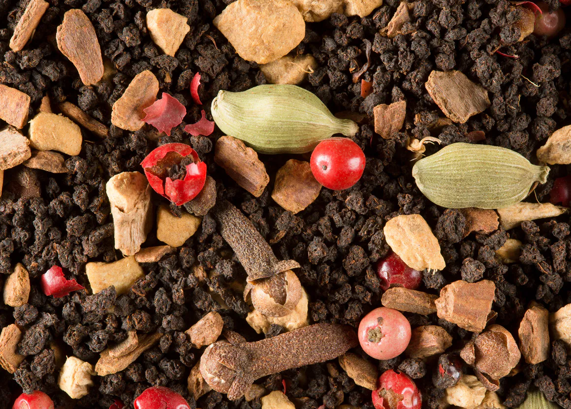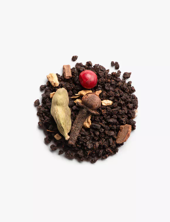 Té negro (Camellia sinensis), especias (jengibre, canela, bayas rosas, cardamomo, clavo)