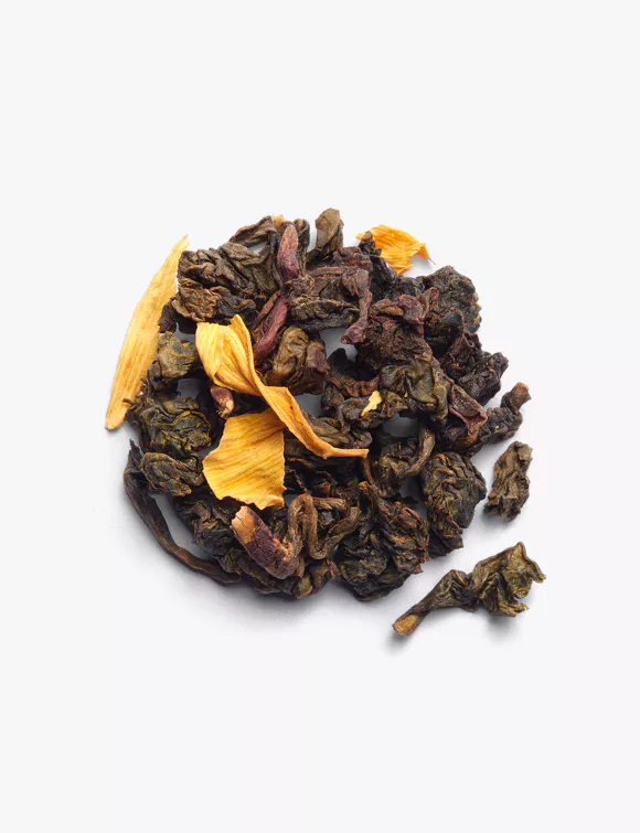 Té Oolong (Camellia sinensis), aroma de caramelo con mantequilla salada, pétalos de flores