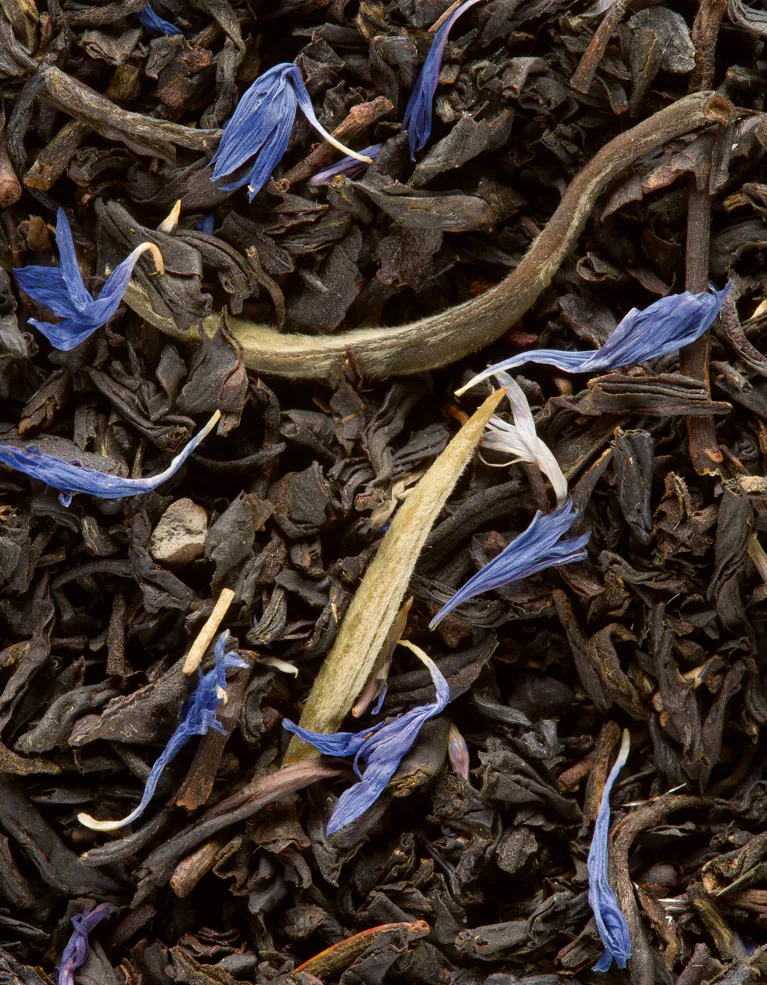 Té negro (Camellia sinensis), aceite esencial de bergamota, pétalos de flores, té blanco puntas blancas