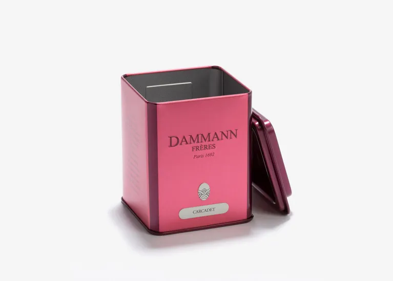 Lata vacía de color rosa de Dammann con la inscripción «Carcadet», ideal para guardar hasta 100 g de tu té o infusión favorita, en función del tamaño de las hojas. Capacidad: hasta 100 g en función del tamaño de las hojas. L/a/f: 7,5/9,5/7,5 cm