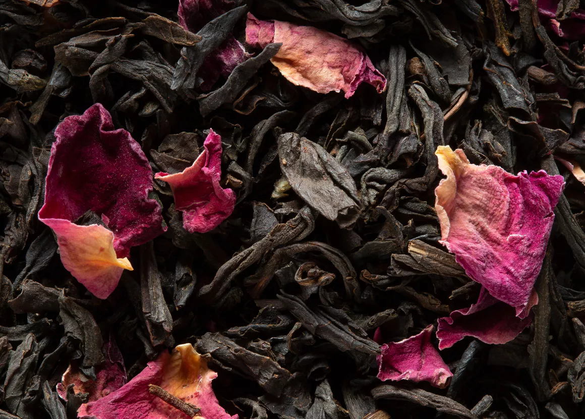 Thé noir (Camellia sinensis), arômes (cacao, biscuit, amande), pétales de fleur