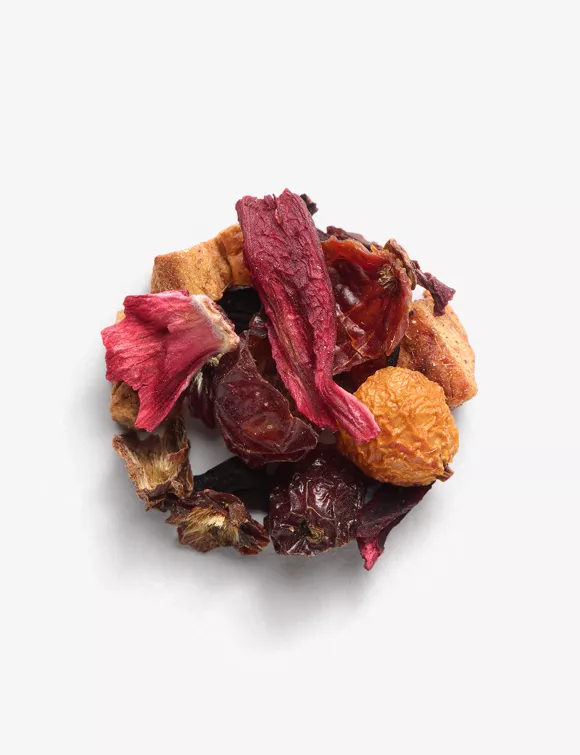 Mélange de fleurs d’hibiscus, de morceaux de pomme, de cynorrhodon, arômes framboise, fraise et crème.