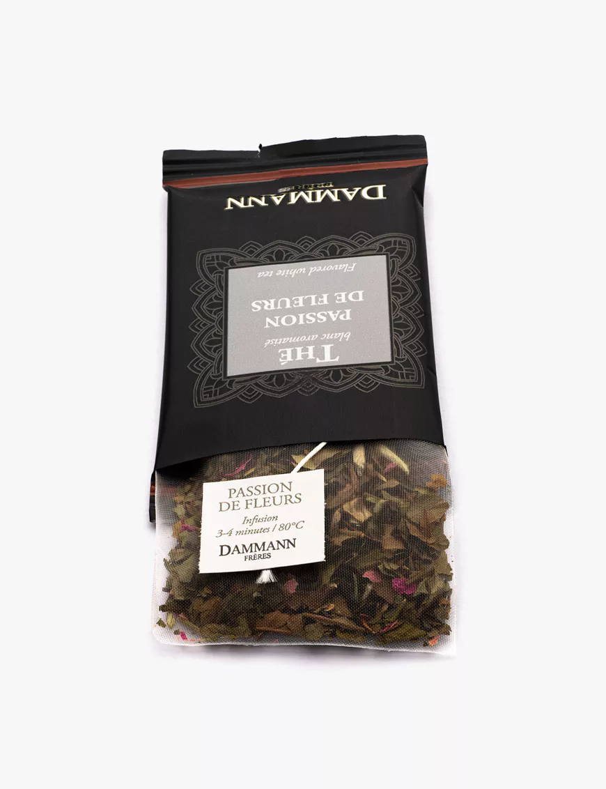 Caja 24 Passion De Fleurs: La delicadeza del té blanco combinada con la sutileza de los aromas de rosa, albaricoque y fruta de la pasión. Enriquecida con pétalos de flores, esta mezcla proporciona una taza fresca y fragante. Para