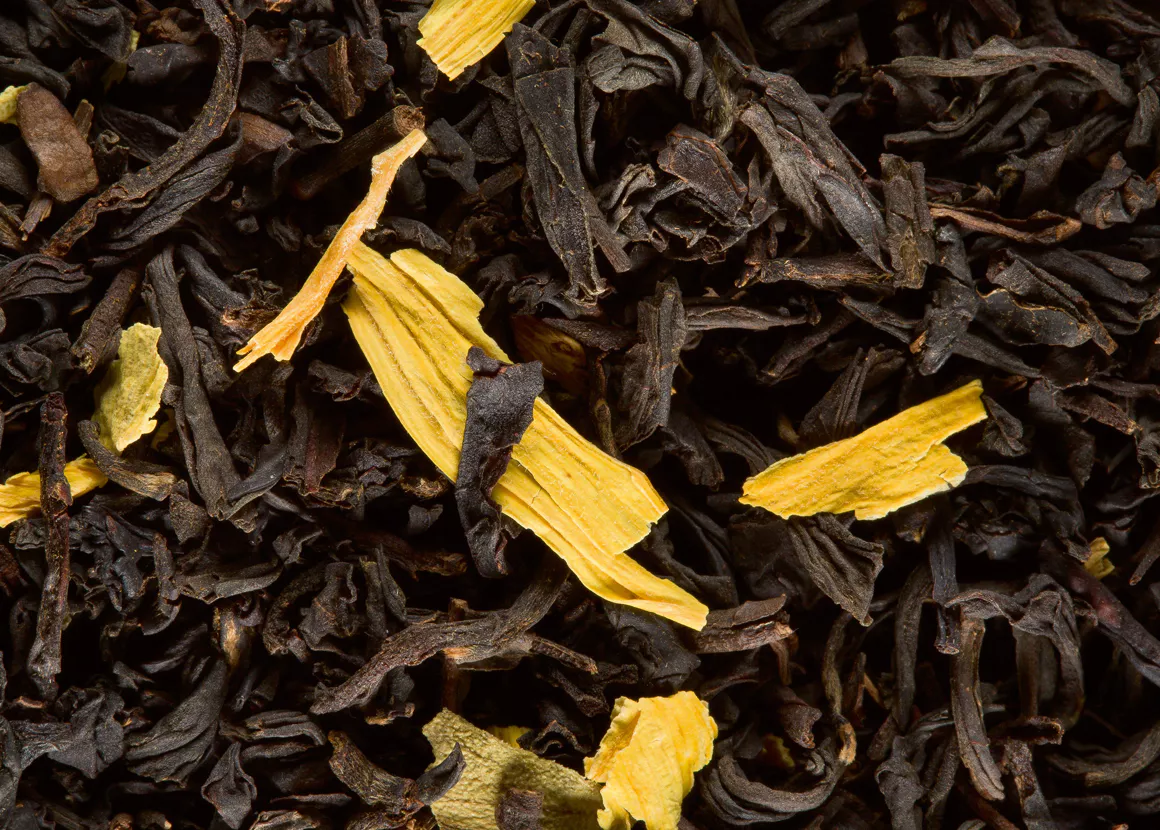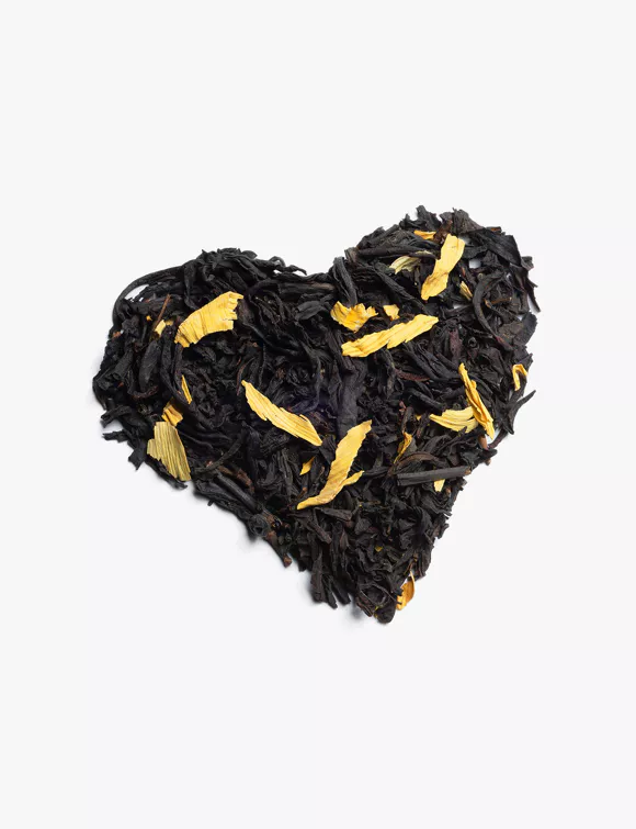 Thé noir (Camellia sinensis), arômes (pomme caramélisée, marasquin), pétales de fleur